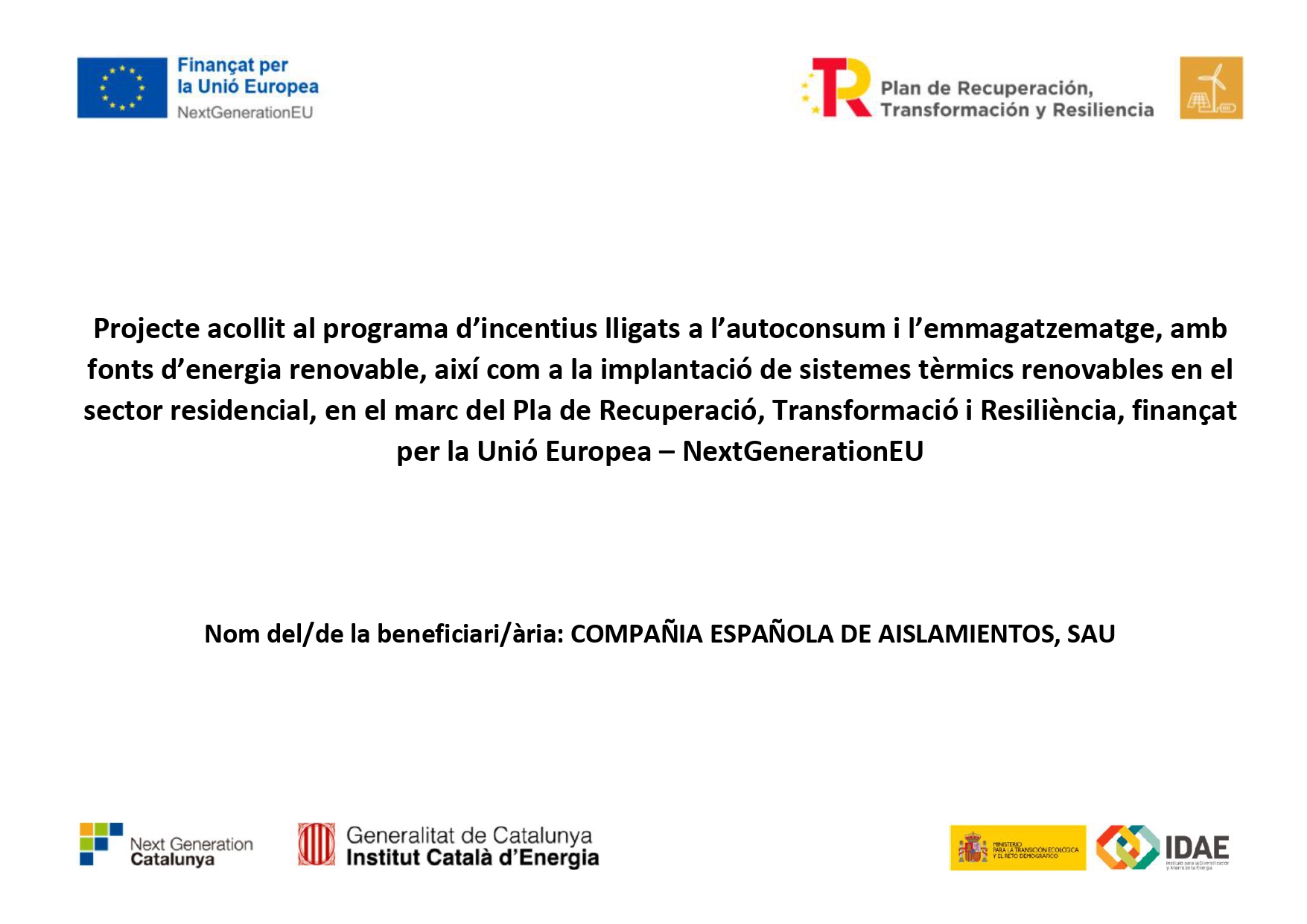 COMPAÑÍA ESPAÑOLA DE AISLAMIENTOS, SAU estamos comprometidos con el medio ambiente, por lo que hemos instalado Paneles Solares Fotovoltaicos en nuestras instalaciones, proyecto acogido al programa de incentivos ligados al autoconsumo y almacenamiento, con fuentes de energía renovable, financiado por la Unión Europea con cargo al Fondo NextGenerationEU, en el marco del Plan de Recuperación, Transformación y Resiliencia, en colaboración con el ministerio para la Transición Ecológica y el Reto demográfico, a través del IDAE.